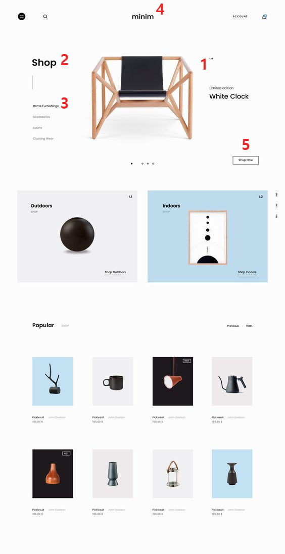 → 넓은 여백, 단순한 색상 구성, 그리드 레이아웃, 정렬된 제품 이미지로 미니멀한 구조