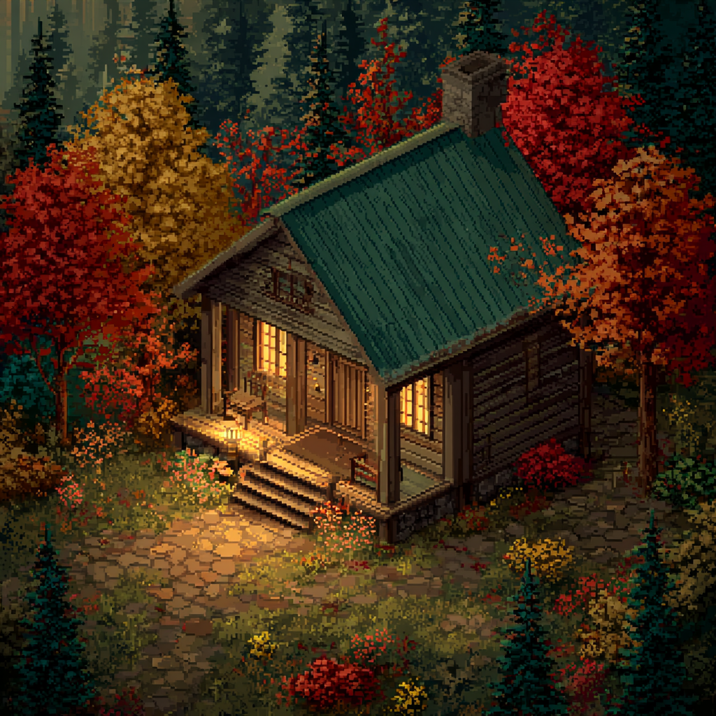 - 프롬프트 : a cozy cabin in the forest, in autumn, warm lighting --ar 1:1