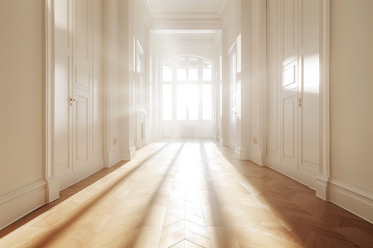 - 프롬프트KR : 아침의 밝은 아파트 복도, 복도 끝의 커다란 창문을 통해 쏟아져 들어오는 따스한 햇살, 부드러운 그림자, 햇살을 반사하는 밝은 색의 나무 바닥, 깨끗한 흰 벽, 아늑하고 평화로운 분위기, 상쾌하고 안정감 있는 느낌, 은은한 렌즈 플레어, 영화 같은 구도, 매우 사실적인