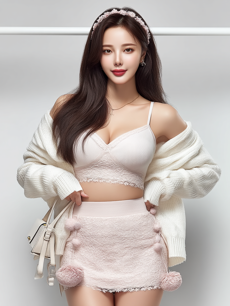 - 프롬프트 : a photo of an asian girl wearing a pink mini dress, a white sweater cardigan with a lace border and puffy sleeves, holding a small handbag in her right hand, with hair accessories on a headband, posing for photos in front of a display rack. the skirt is made from a cotton candy-like material with large pom-poms at both ends, and has bow details around the waist, with light tones and soft lighting. it features cute expressions, cute movements, and high-definition photography quality --p --oref