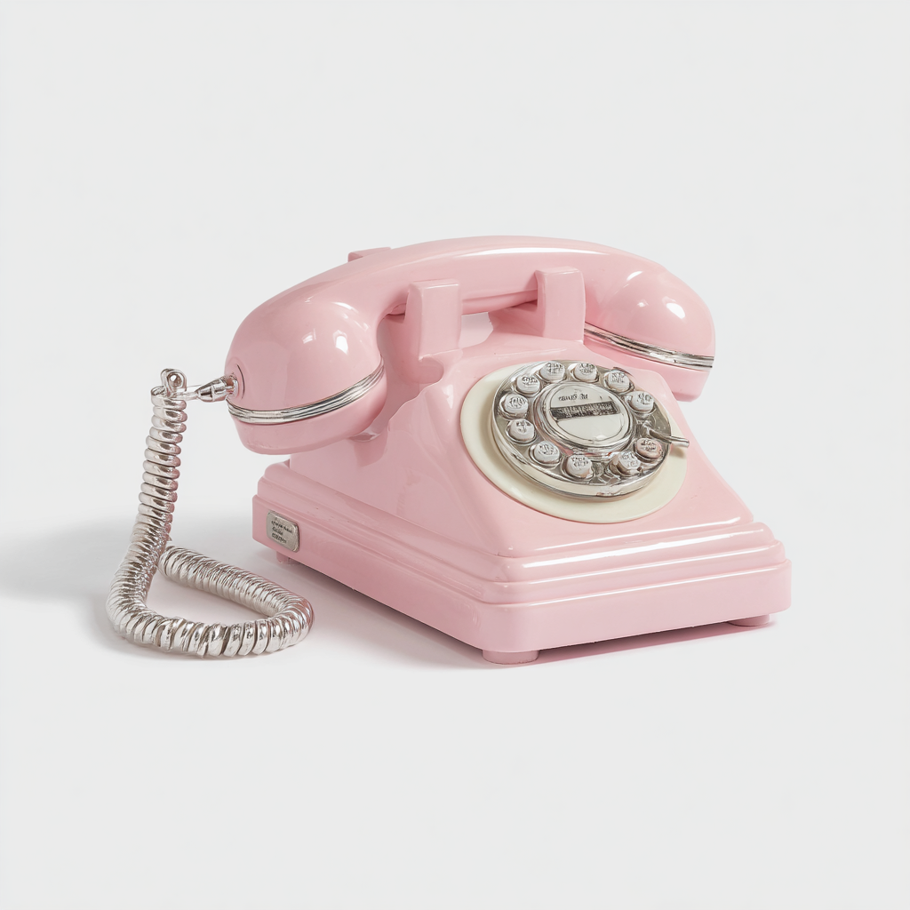 - 프롬프트 : pink vintage telephone with a white background, no text or letters on the buttons, with a white rim around it and its cord wrapped in an elegant spiral pattern of silver metal. the photograph captures only half of one side of the telephone