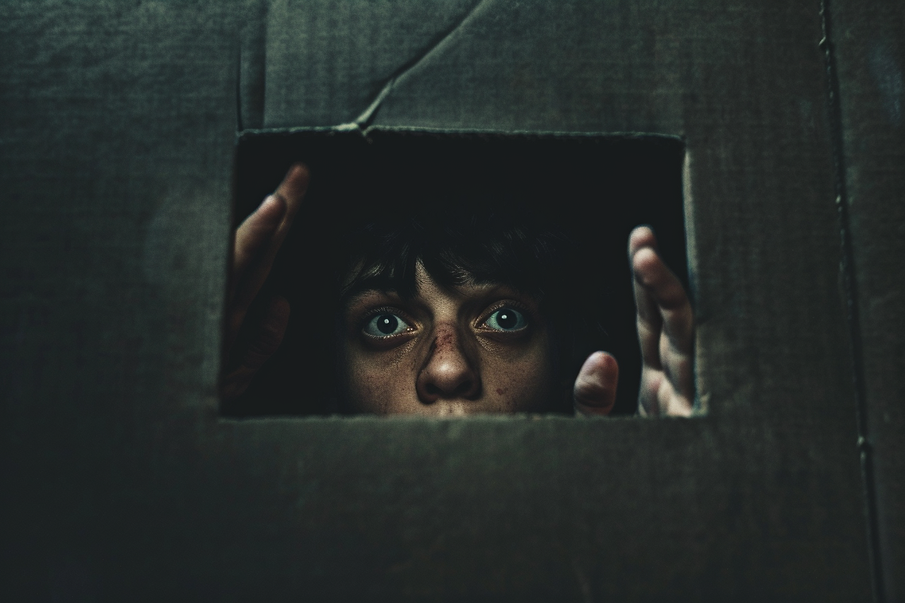 - 프롬프트KR : 극도로 좁고 어두운 상자 안에 갇힌 한 사람, 안쪽으로 밀려오는 벽이 얼굴에 닿을 듯하고, 두 손으로 벽을 밀어내며, 위쪽에서 비치는 거친 빛은 극히 적고, 깊은 그림자가 드리워져 있으며, 숨 막히는 분위기, 공포와 패닉, 밀실 공포를 자아내는 공포감, 영화적인 클로즈업의 긴장감
