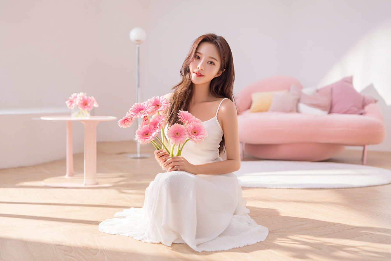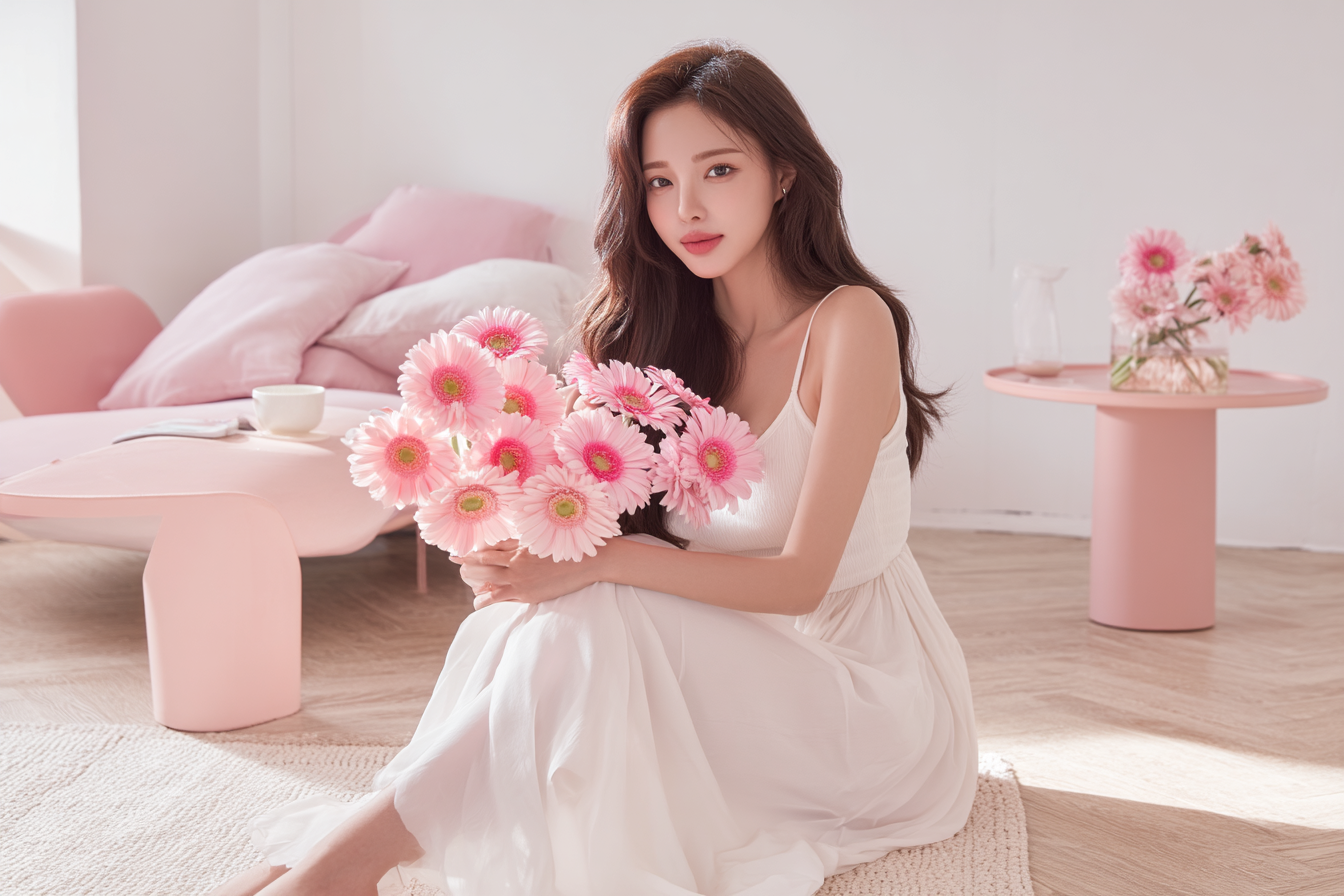 - 프롬프트 : A beautiful Korean woman wearing a white chiffon dress, sitting on the floor holding pink gerbera flowers, soft romantic feminine mood, pastel tones, soft natural light, airy high-key lighting, editorial fashion photoshoot, shallow depth of field, a white wall background with a soft pink chaise lounge and a small round table, in a modern, minimalist interior design. the wooden floor is complemented by soft lighting, creating a high-key, clean, and bright atmosphere with natural light. the close-up of the pastel sofa features pink flowers in vases on the side tables, adding a fresh and warm tone to the entire scene, giving people an elegant feeling, high resolution, with high details and high quality, and appears to be professional photography using natural light, soft shadows, and clean, sharp focus --ar 3:2 --oref https://s.mj.run/kSid38d8fMg
