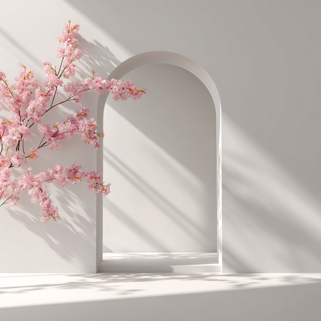 - 프롬프트 : 3d arch with shadows and light, white wall background, pink sakura flowers on the left side of an arched door frame, minimalist stage design style, in the style of oshare kei, sun rays shining in, white background, empty space in the center, mockup product photography