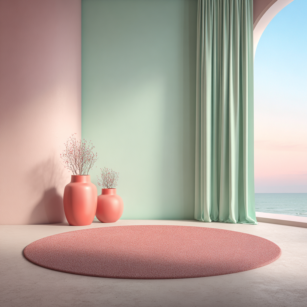 - 프롬프트 : modern minimalist style, light pink and mint gradient background wall, empty floor space with a round carpet in the center of the picture, pink vases on both sides of the flat surface, light green curtains on the right side, symmetrical composition, warm color tone, soft lighting, calm atmosphere, natural scenery outside the window, fresh colors, a sense of calmness and tranquility