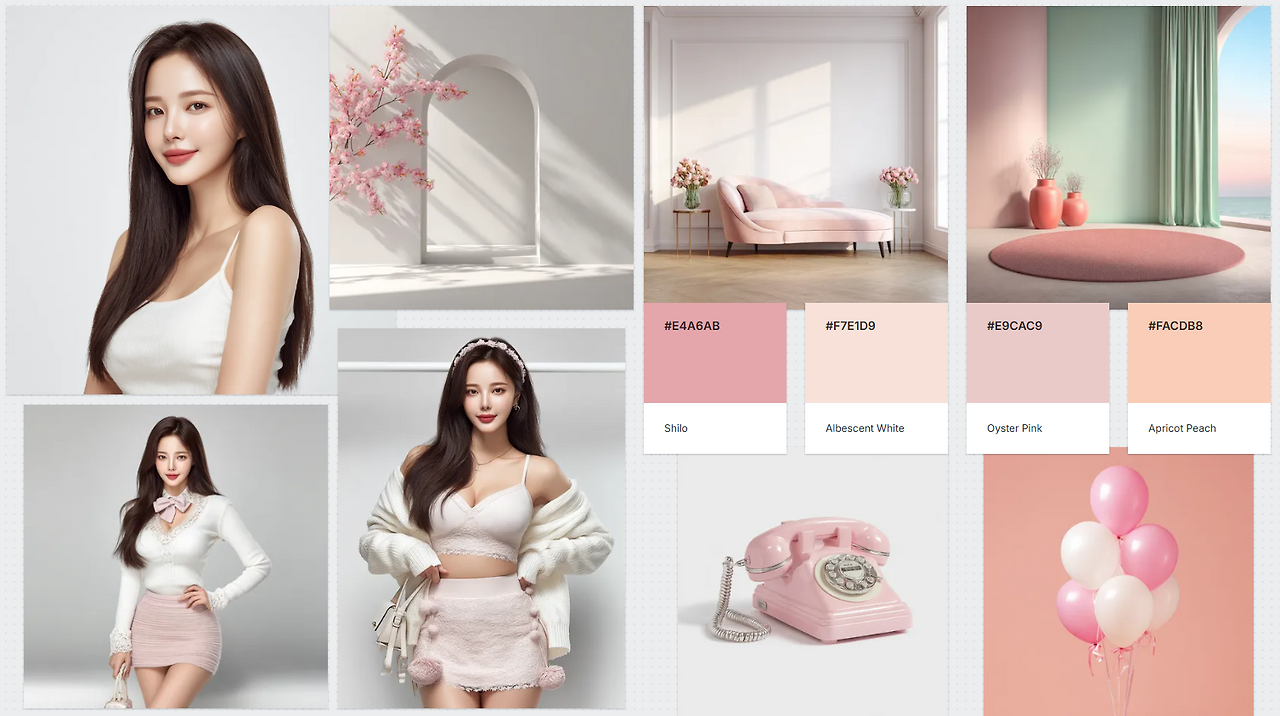 - 프롬프트 : A beautiful Korean woman wearing a white satin mini dress with floral embellishments on the right side. The dress features a strapless top and a flared skirt, boasting a high-waisted design and a figure-hugging silhouette. She stands against a soft, solid pink background, with white and pale pink balloons tied with ribbons serving as props --oref https://s.mj.run/kSid38d8fMg